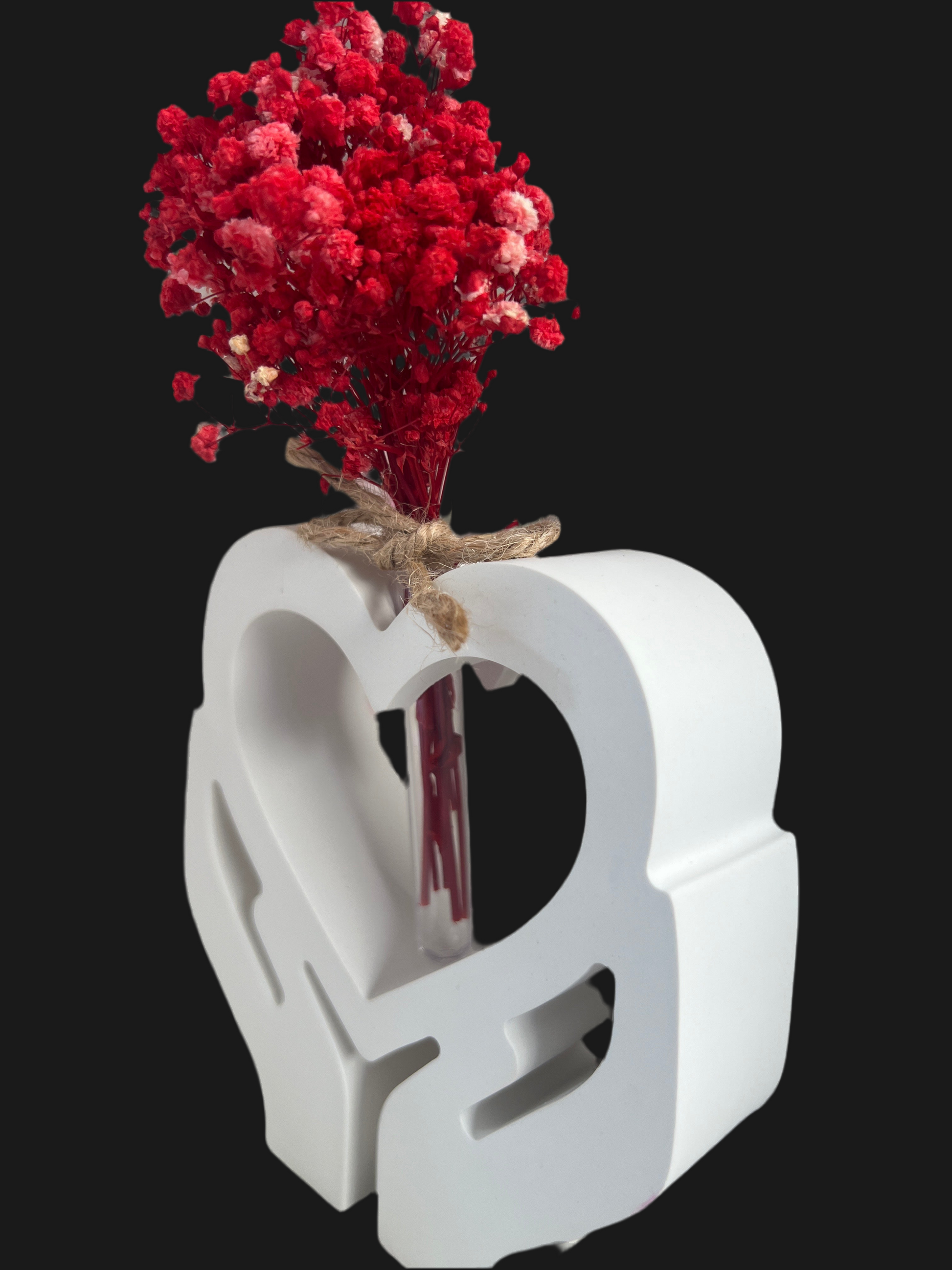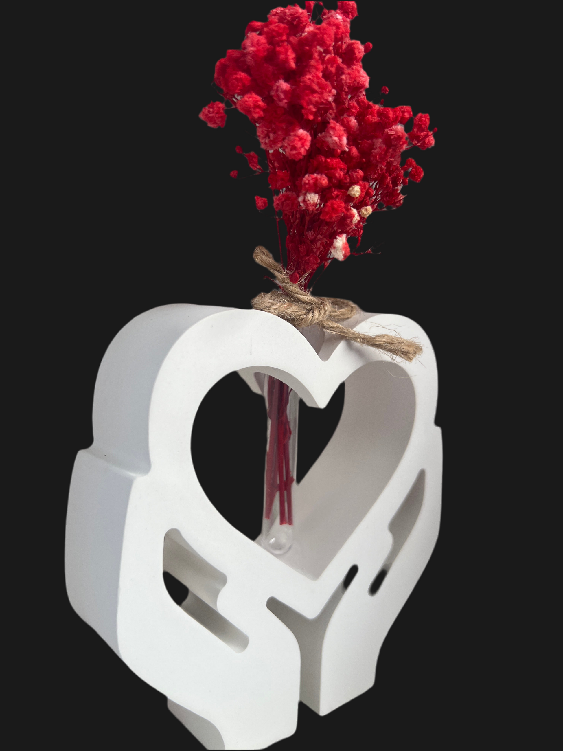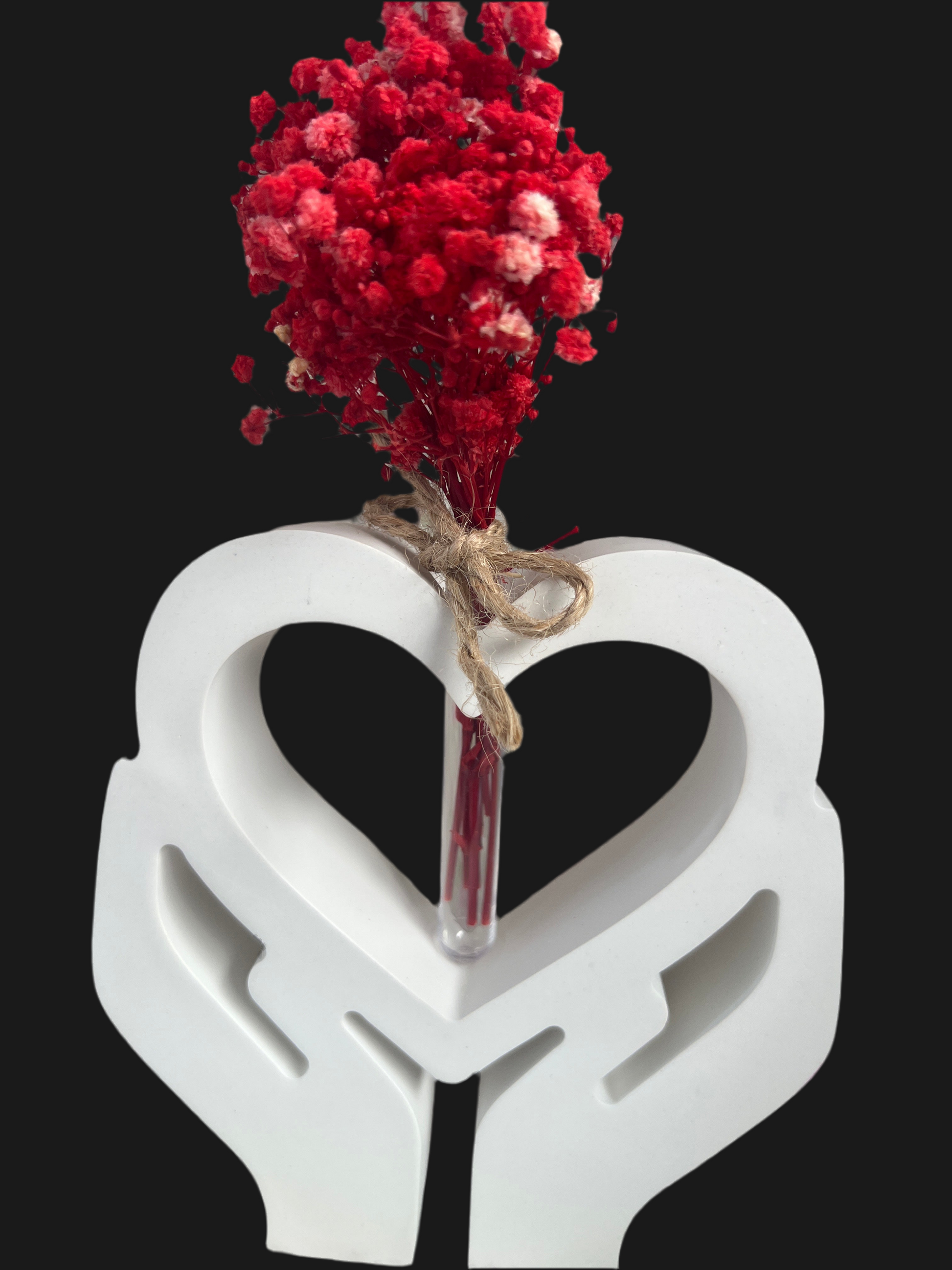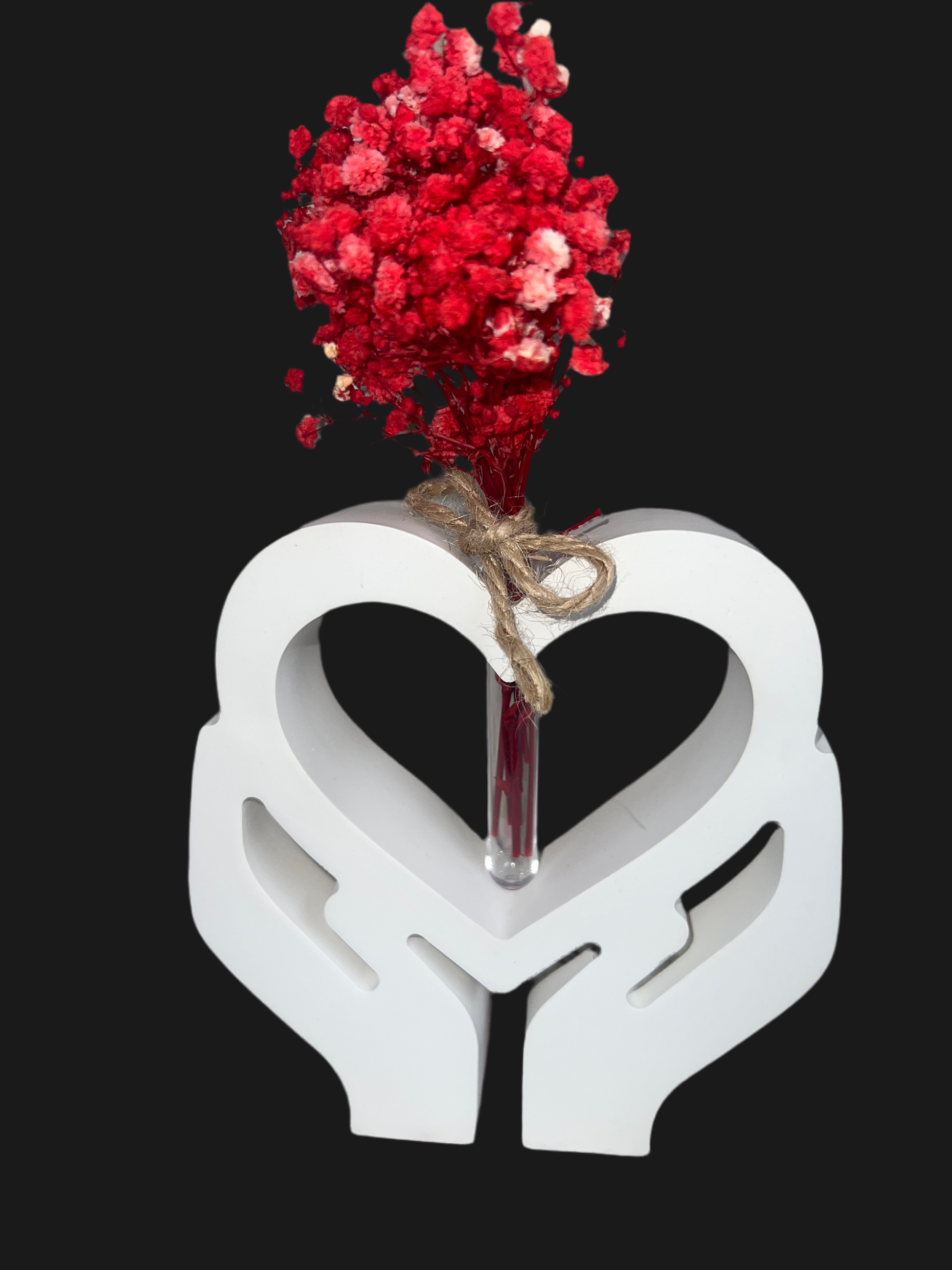 Herz in Händen mit Trockenblumen in Reagenzglas handgefertigt aus Keramik in der Farbe Weiß