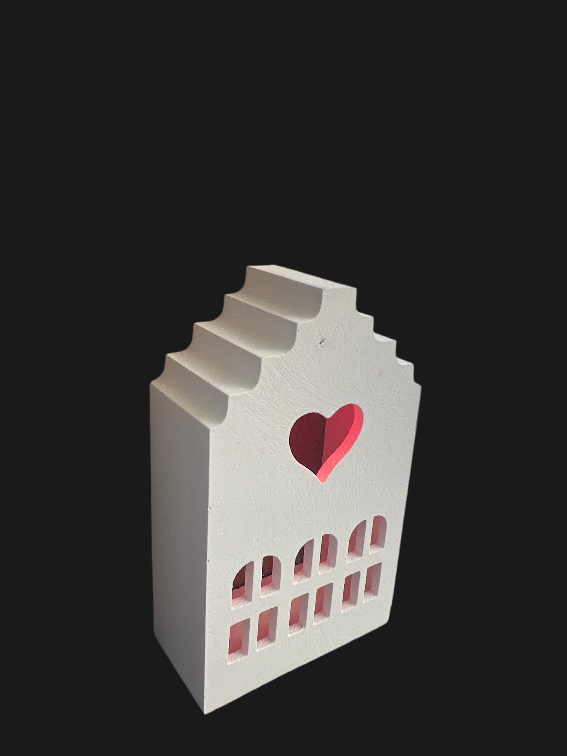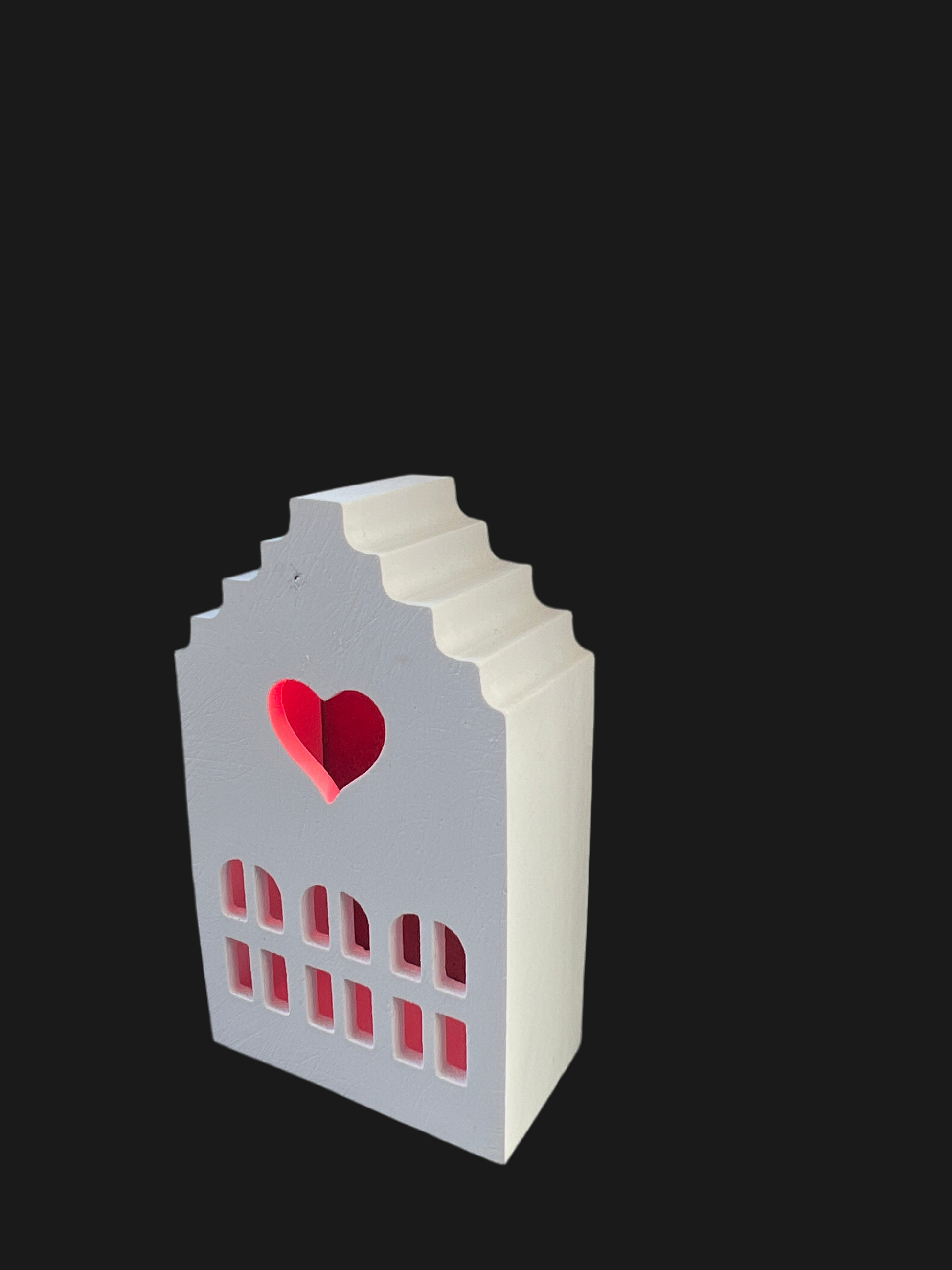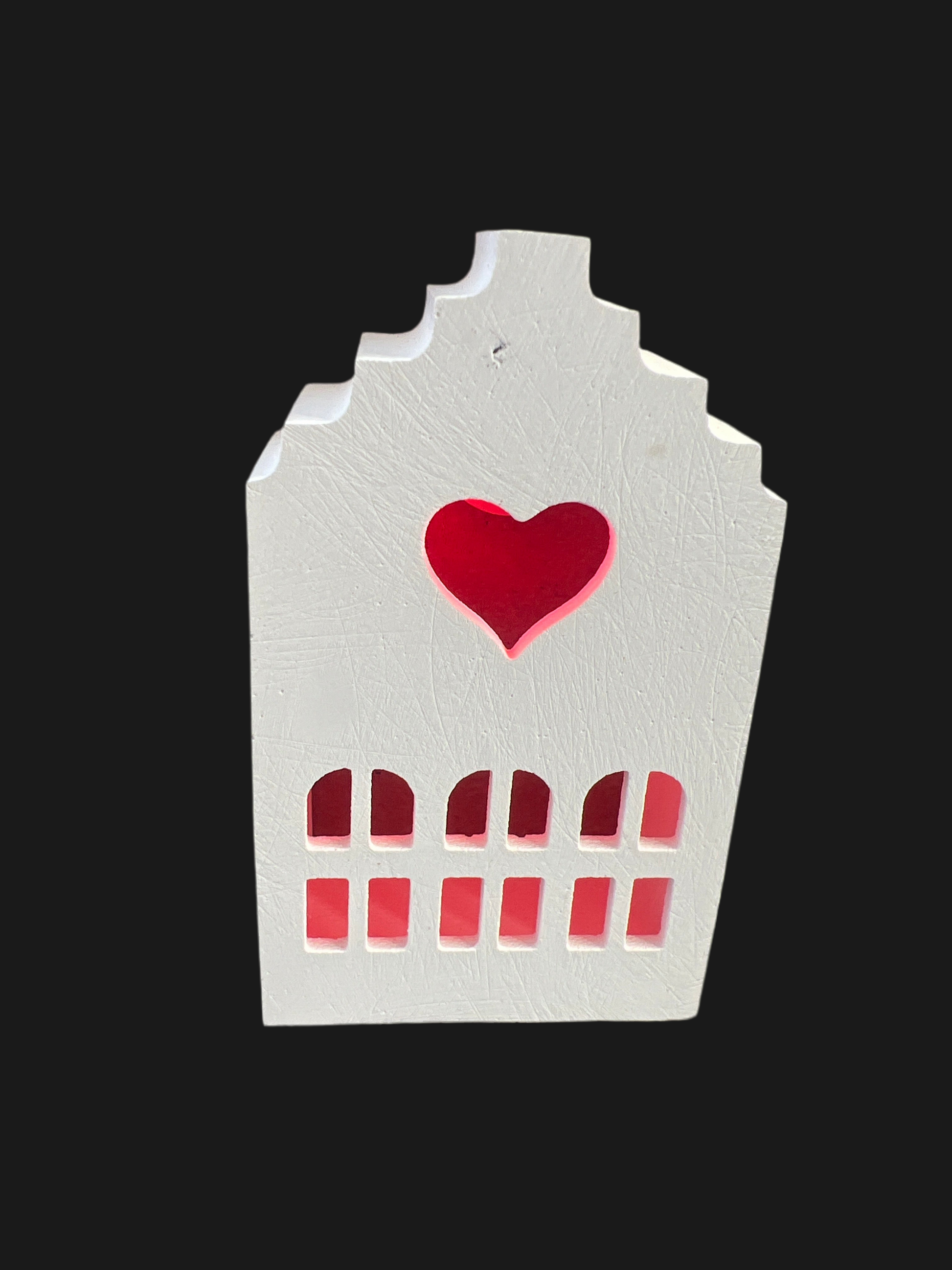 Medium - Lichthaus # 2 „Front mit Herz mit großen schmalen Fenstern & Stufendach“ mit LED-Ballonlicht rot aus Keramik handgefertigt in der Farbe weiß
