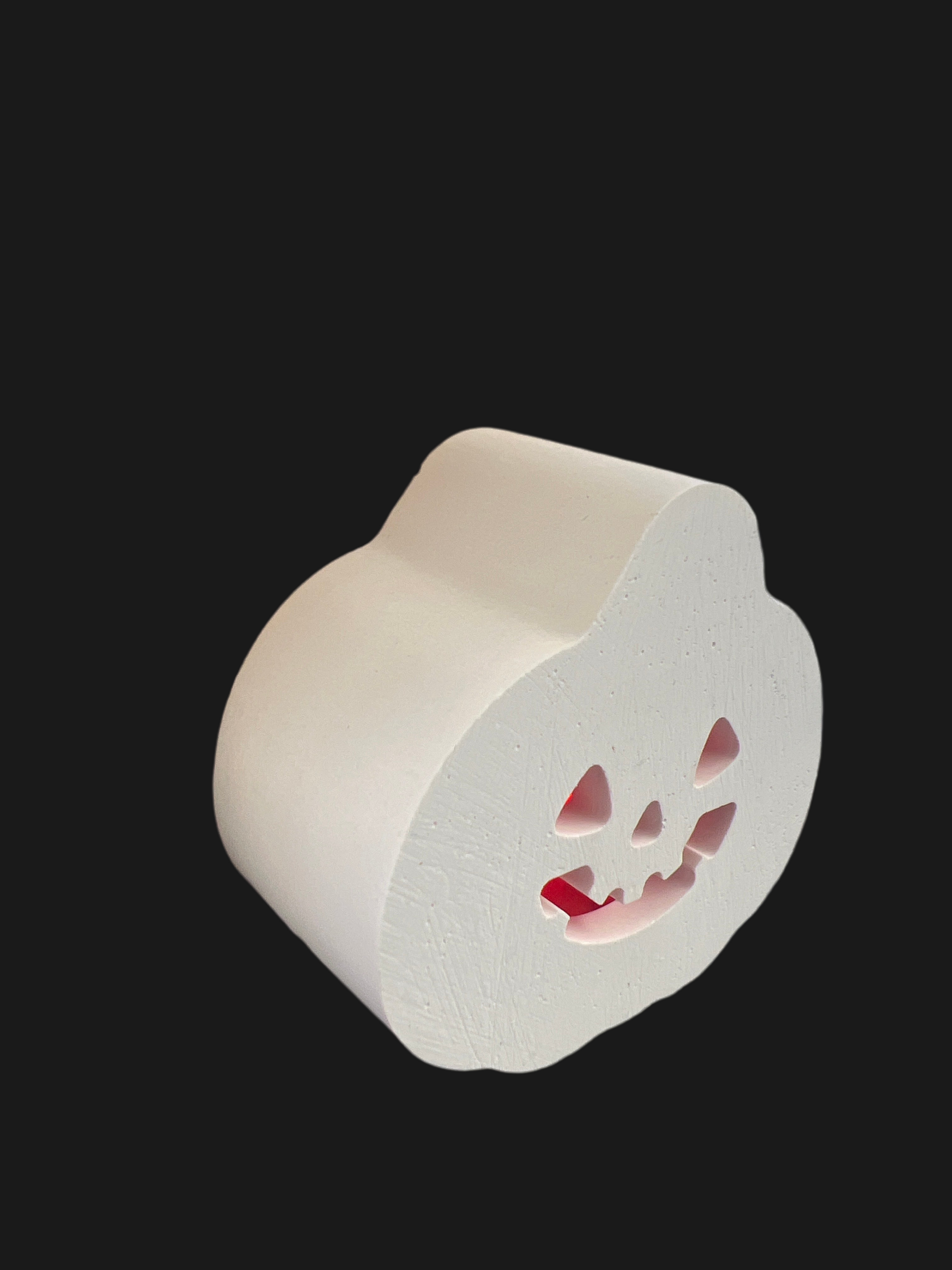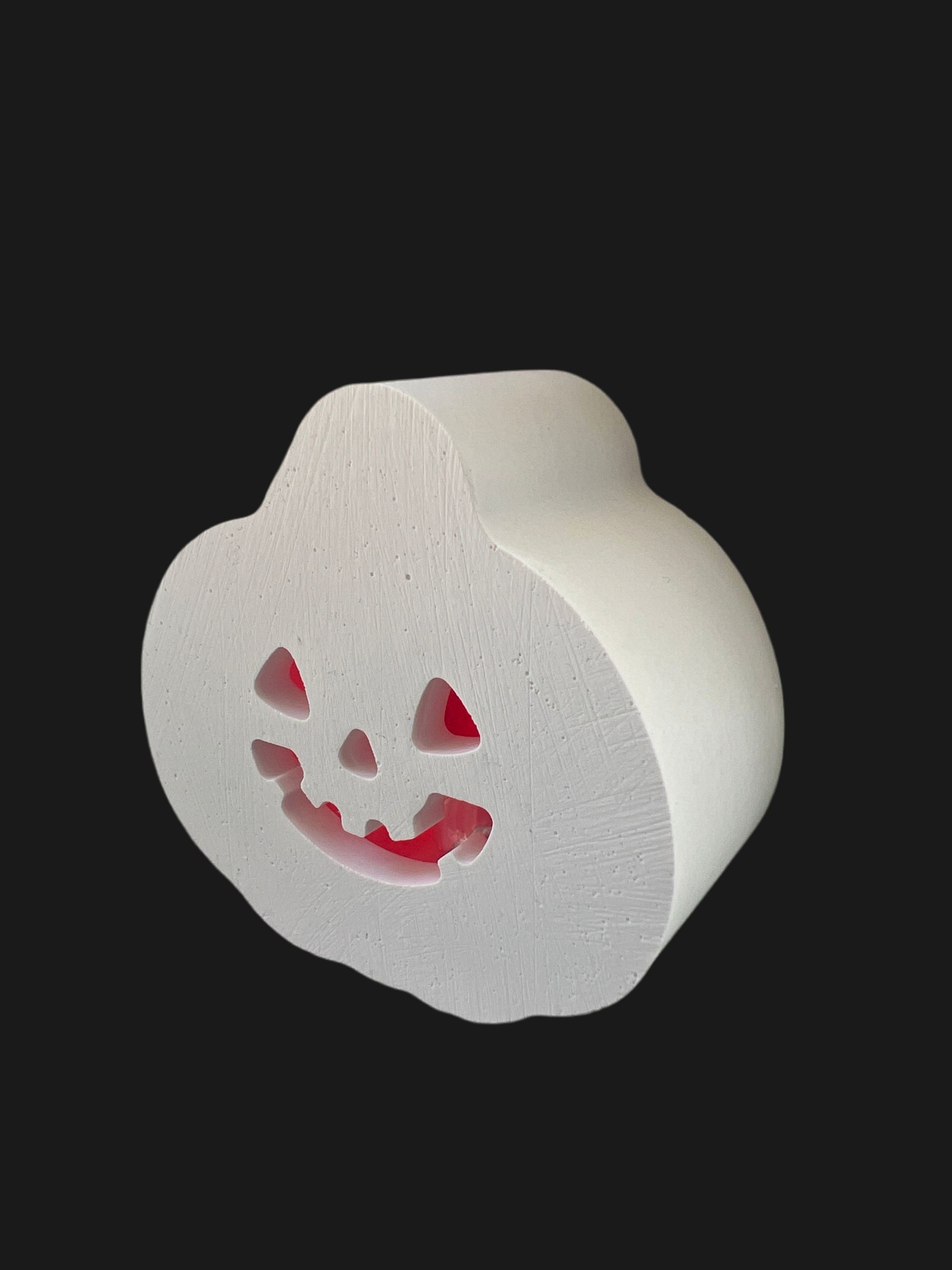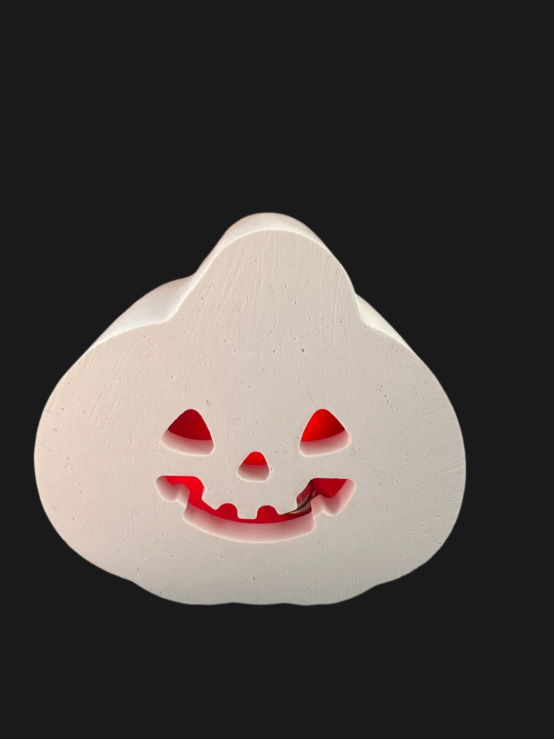 Mini - Licht Kürbis # 04 „Front lachender Kürbis mit dreieckigen Augen“ mit LED-Ballonlicht rot aus Keramik handgefertigt in der Farbe weiß