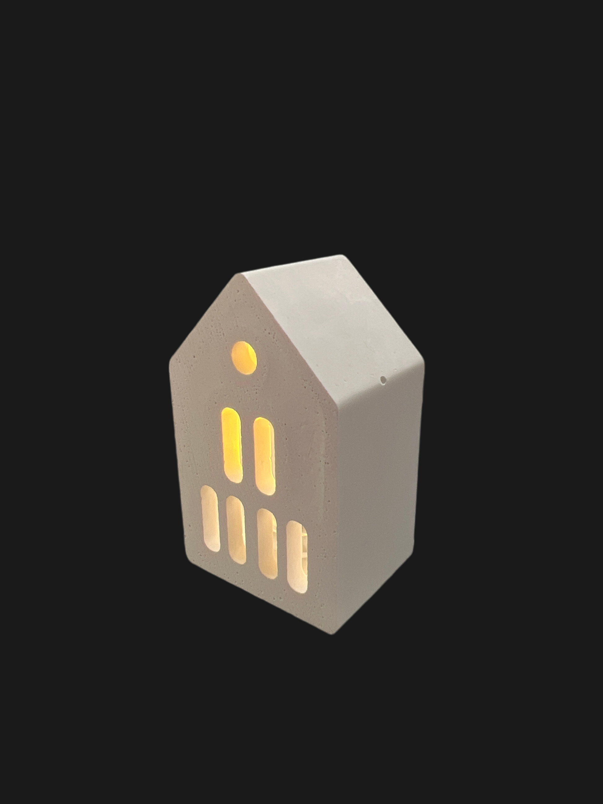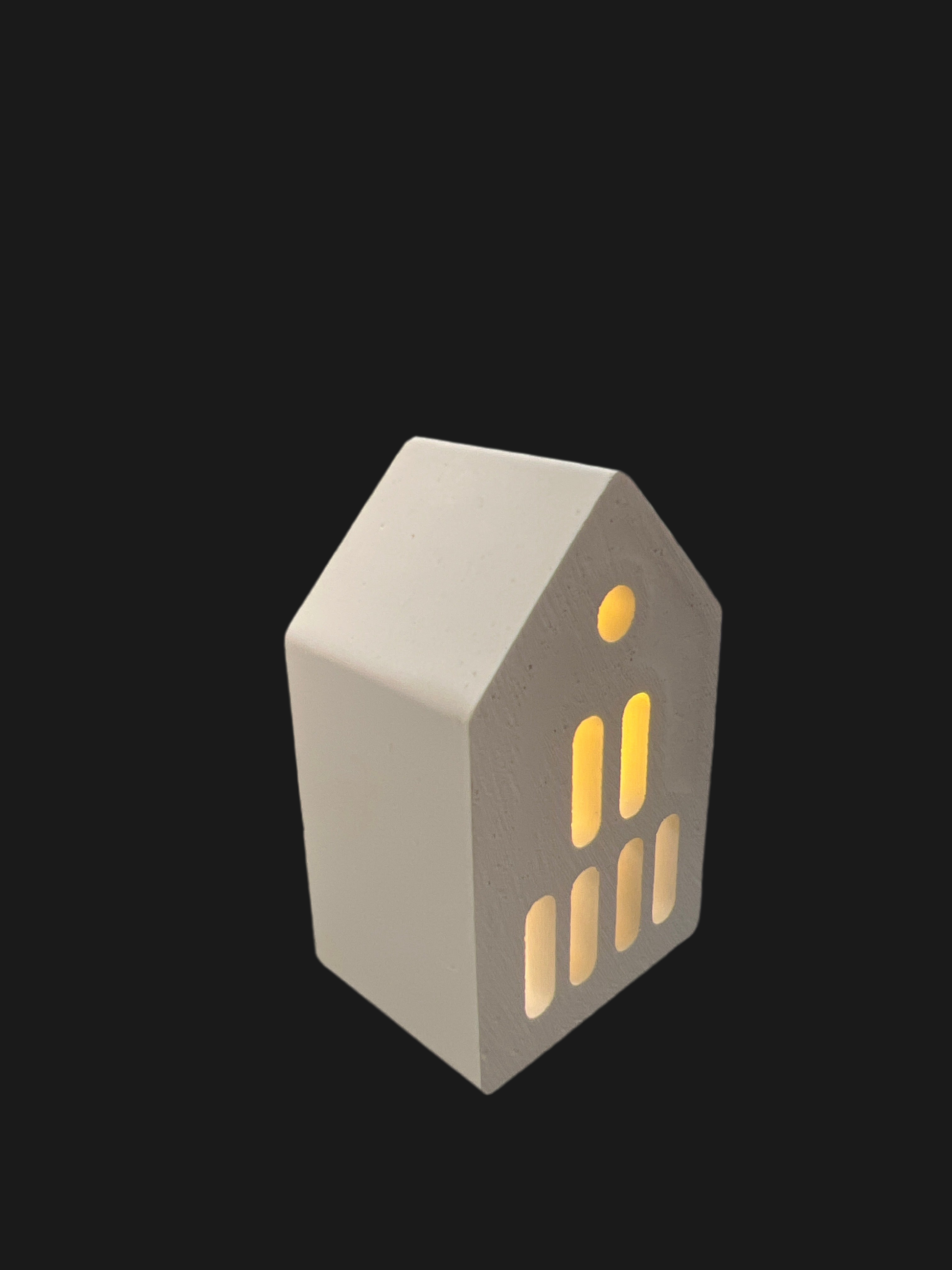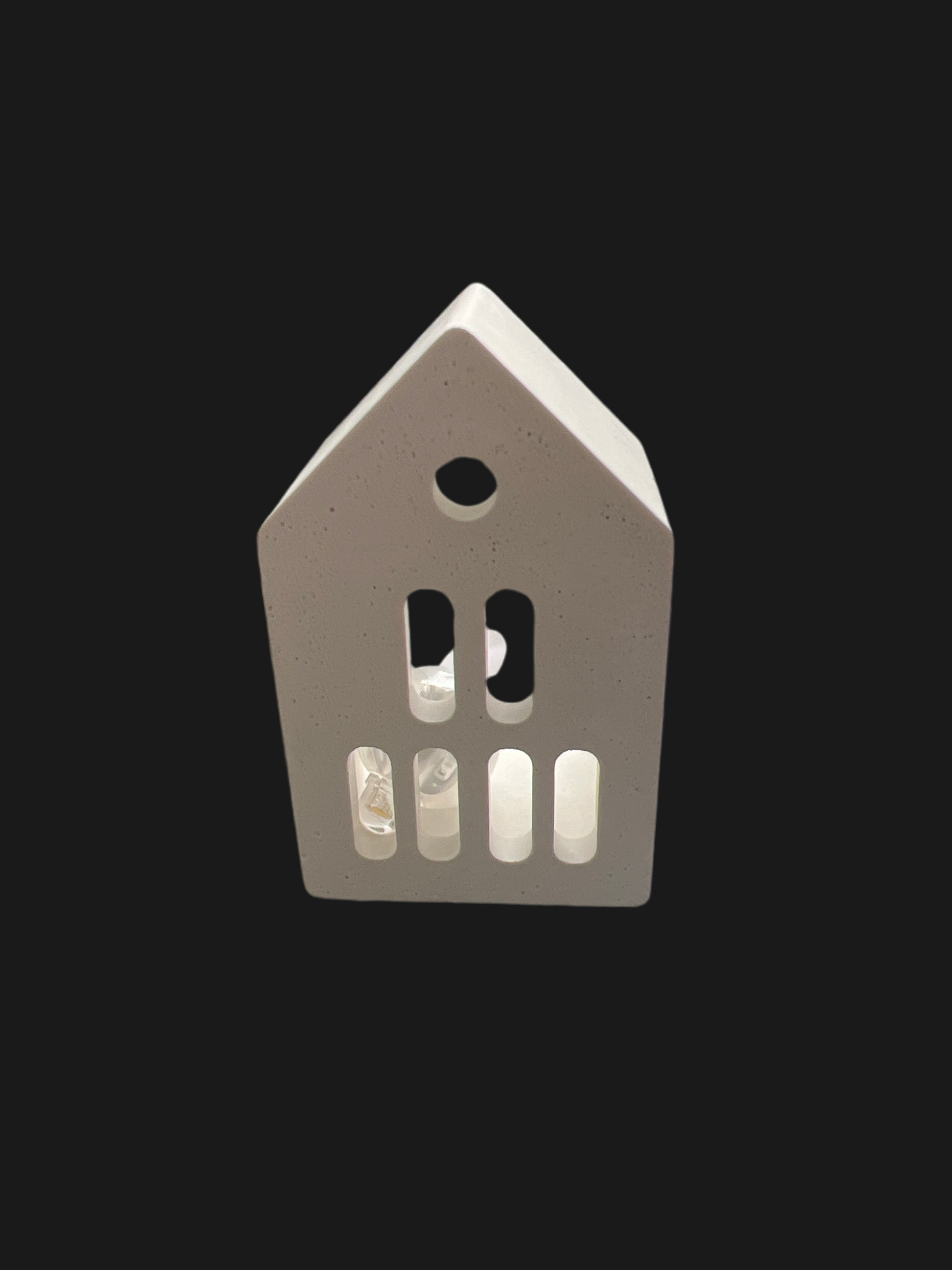 Mini - Lichthaus # 03 „Front mit großen schmalen Fenstern“ mit LED-Ballonlicht warmweiß aus Keramik handgefertigt in der Farbe weiß