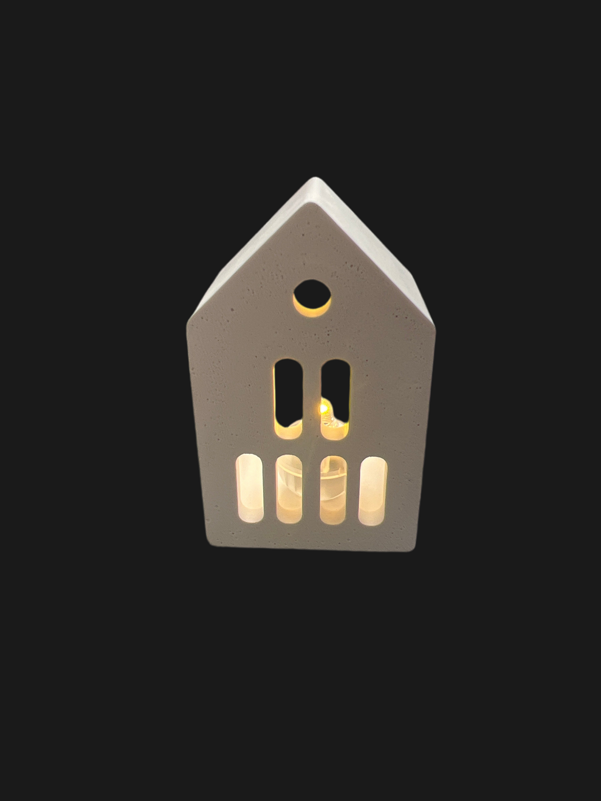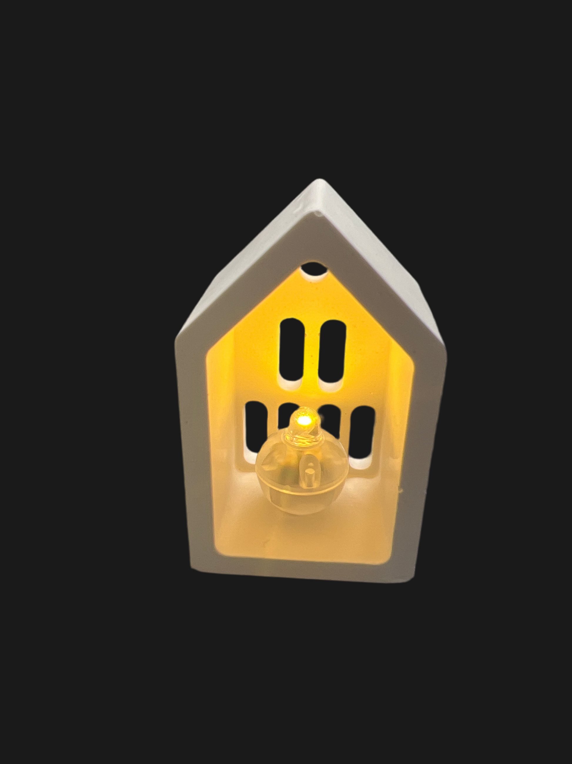 Mini - Lichthaus # 3 „Front mit großen schmalen Fenstern“ mit LED-Ballonlicht warmweiß aus Keramik handgefertigt in der Farbe weiß