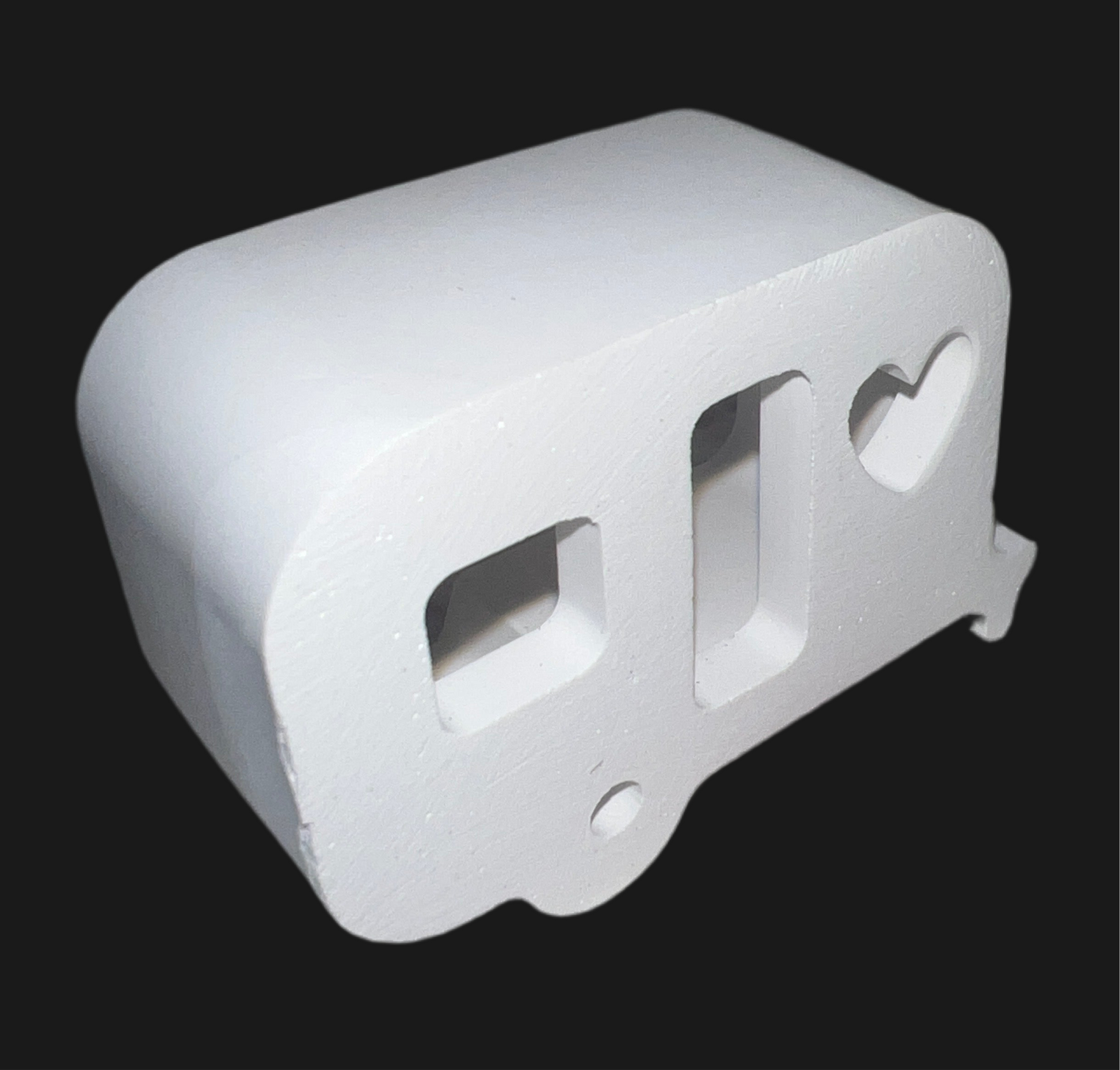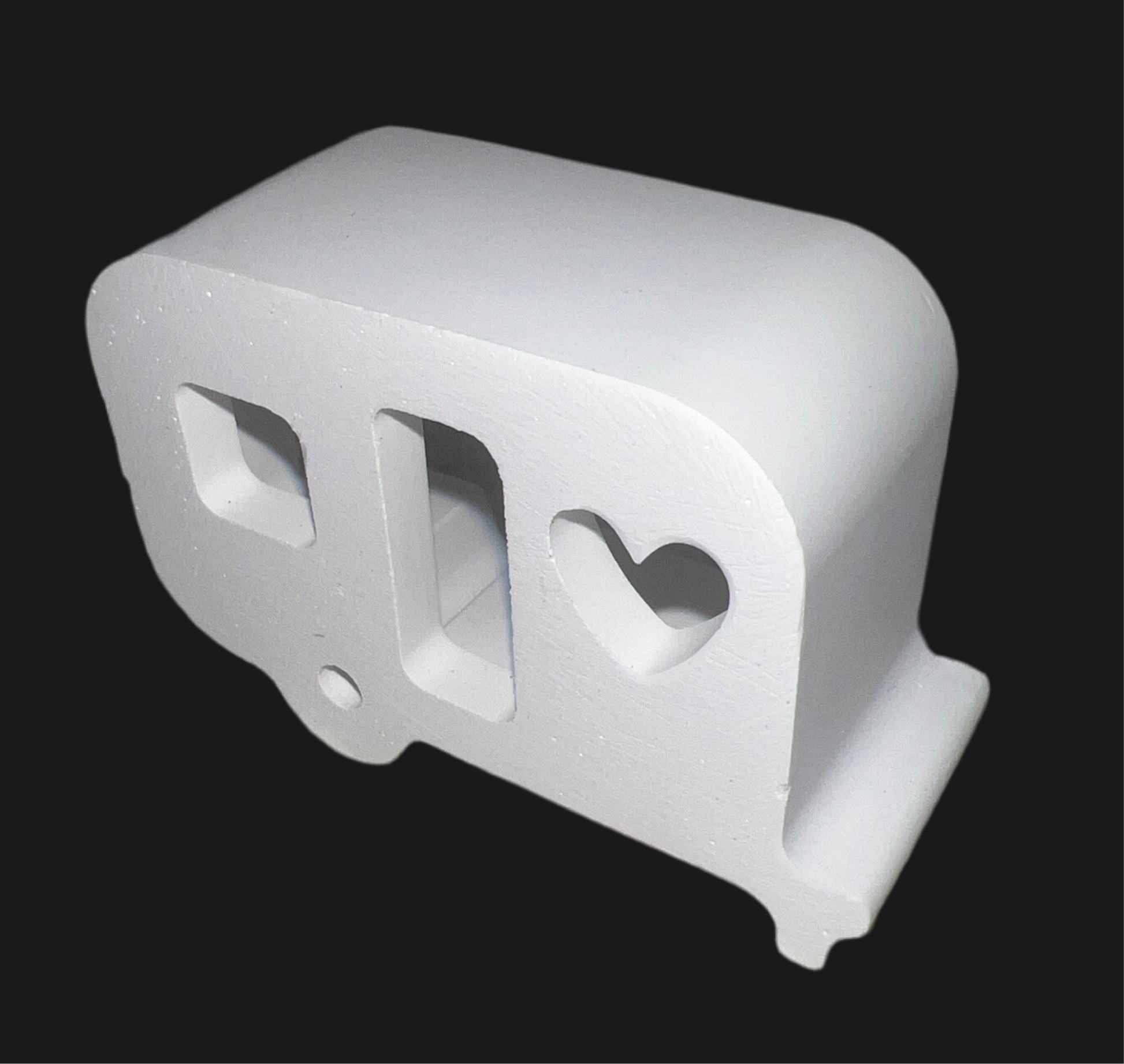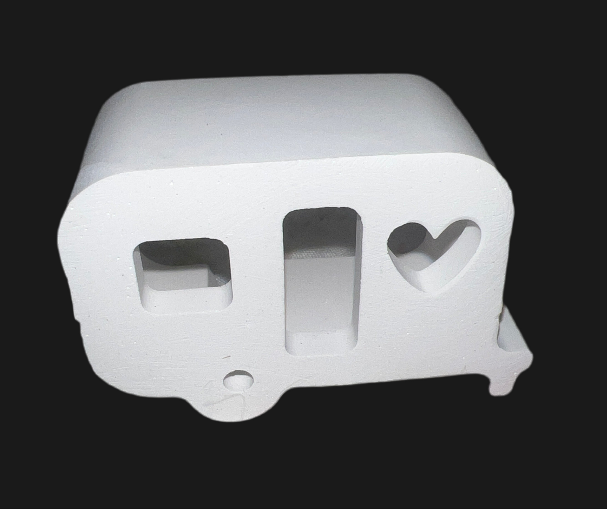 Mini - Wohnwagen „ab in den Urlaub“ # 03 Front mit Herzen mit LED-Ballonlicht warmweiß aus Keramik handgefertigt in der Farbe weiß