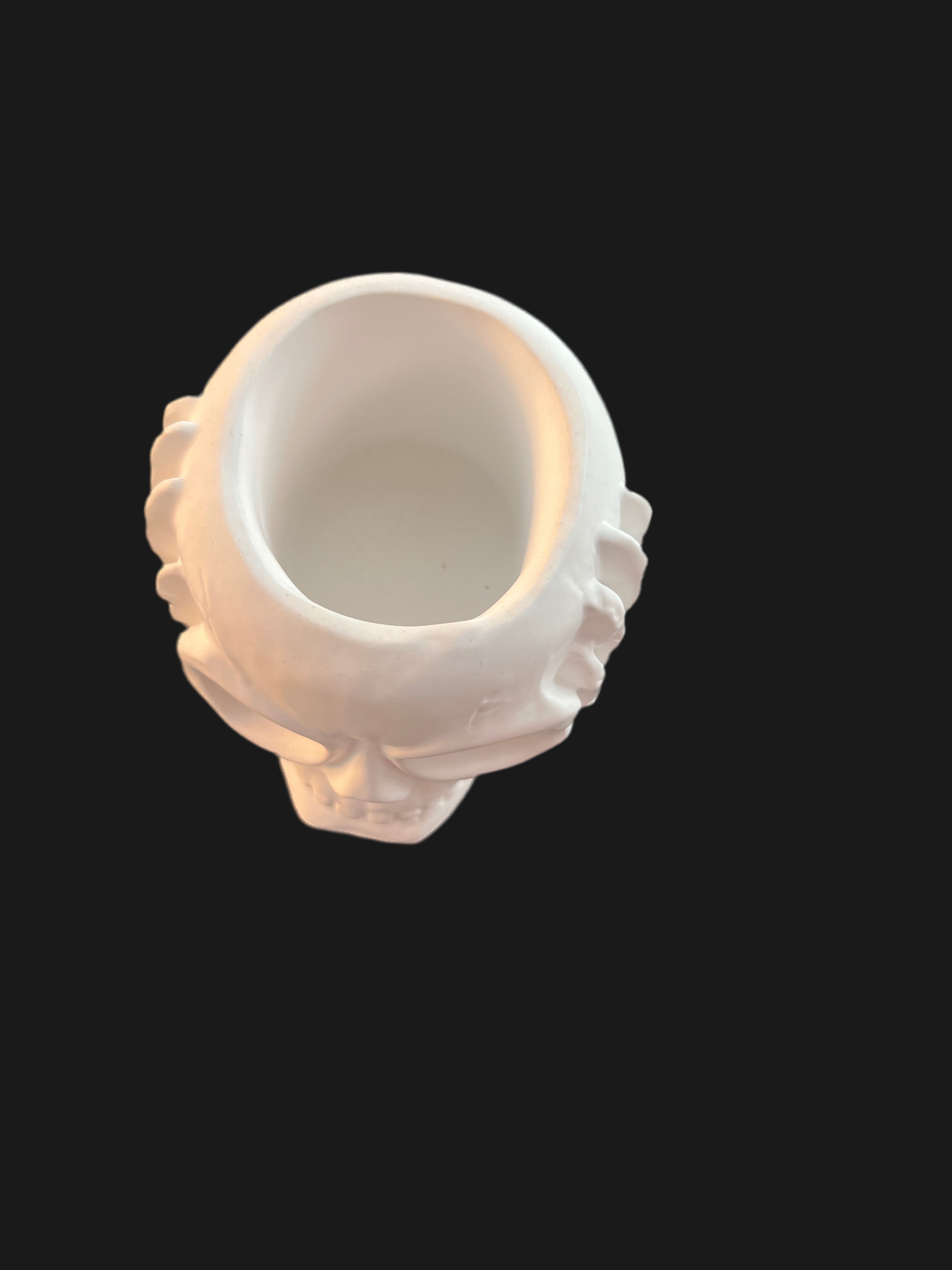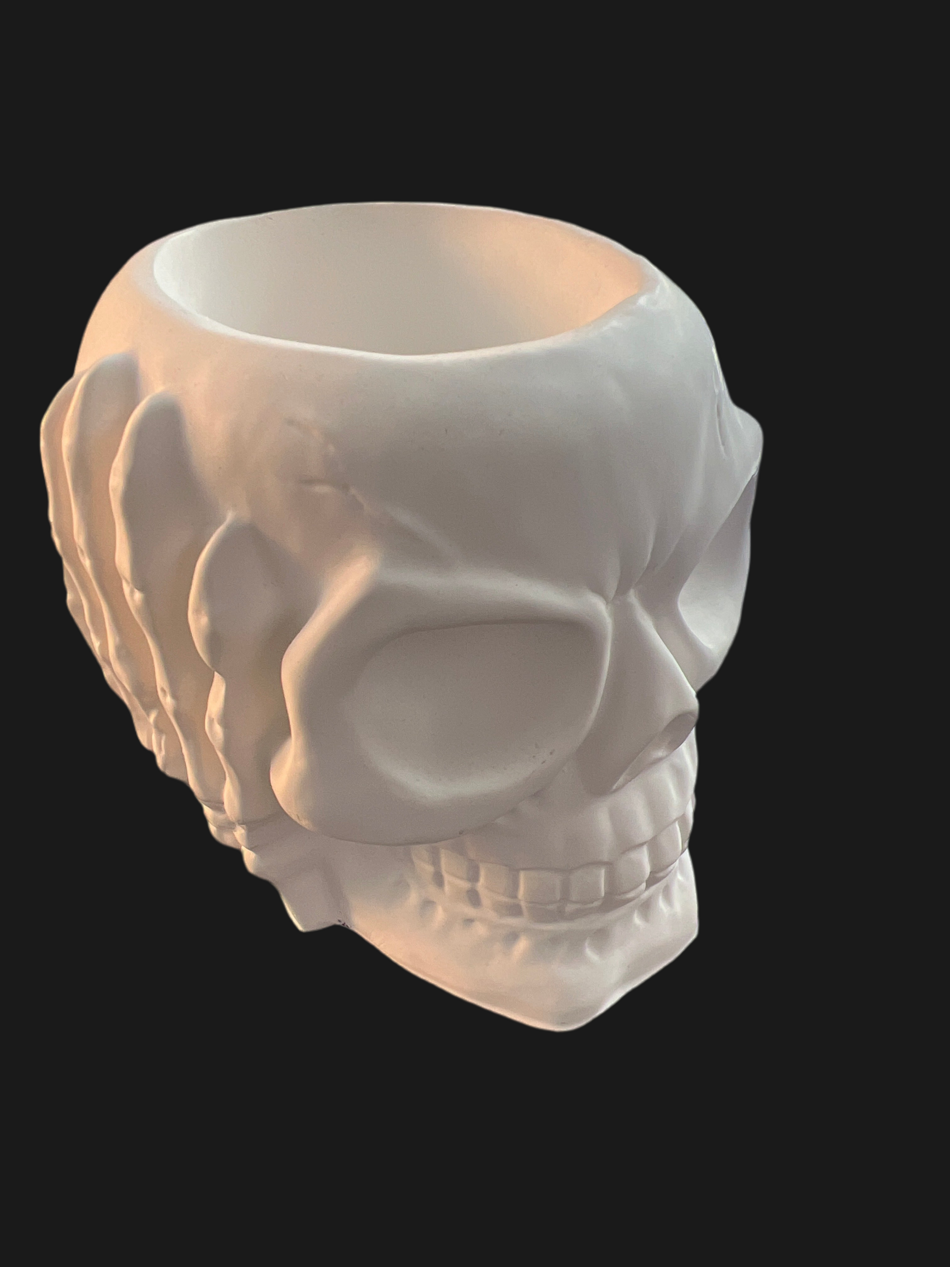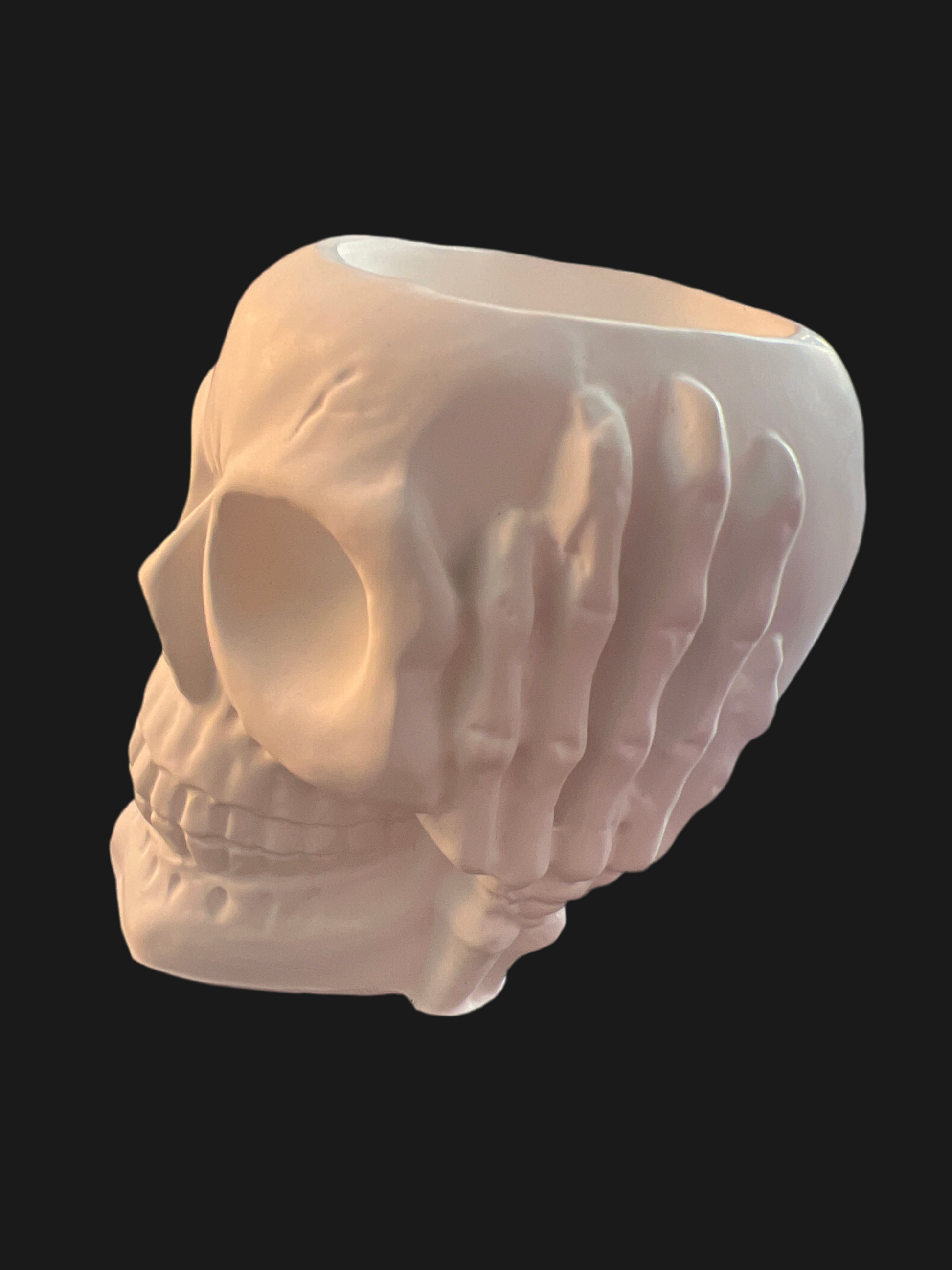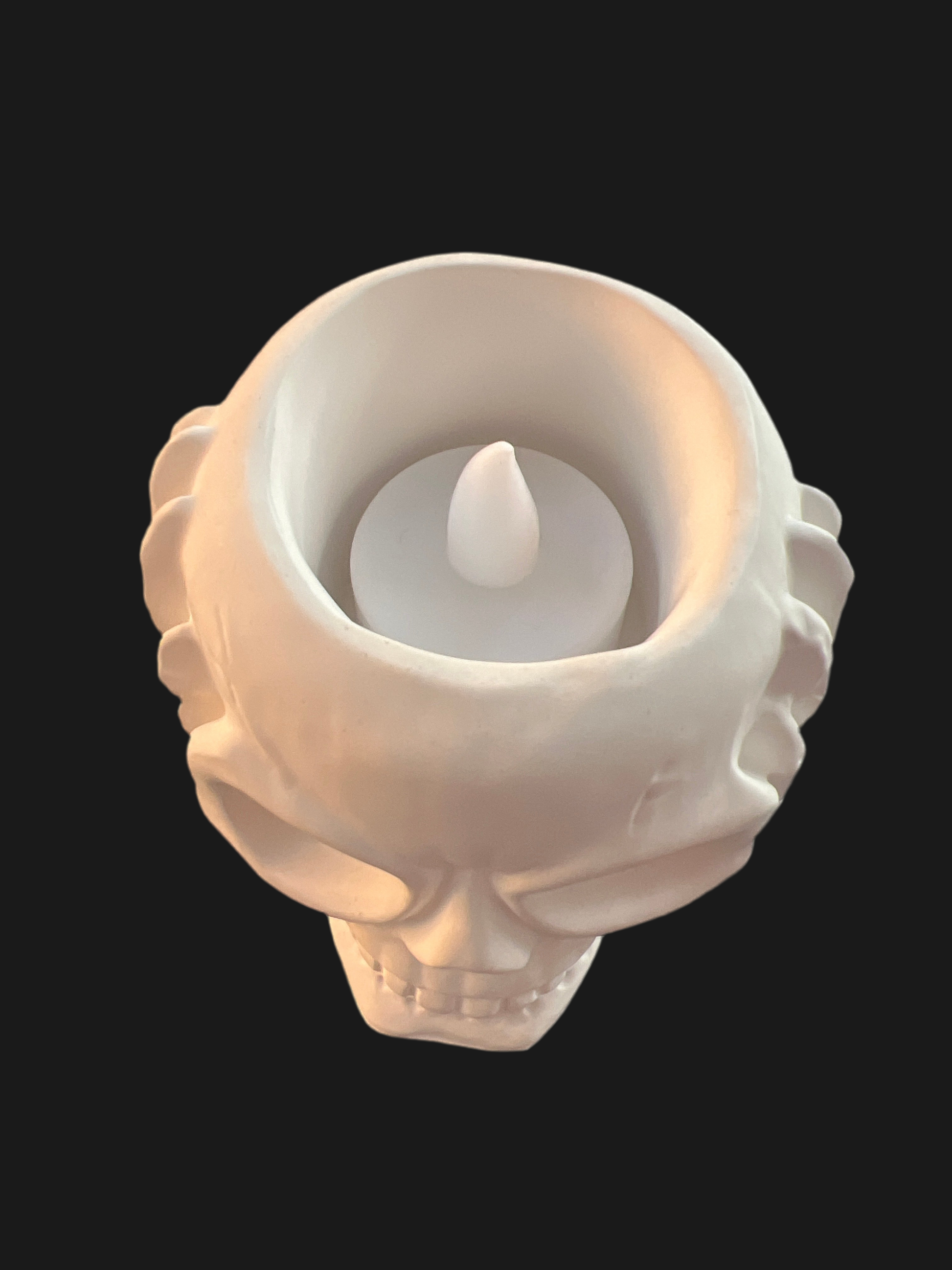 Totenkopf Schädel „nichts hören“ handgefertigt in der Farbe weiß aus Keramik mit LED-Teelicht warmweiß
